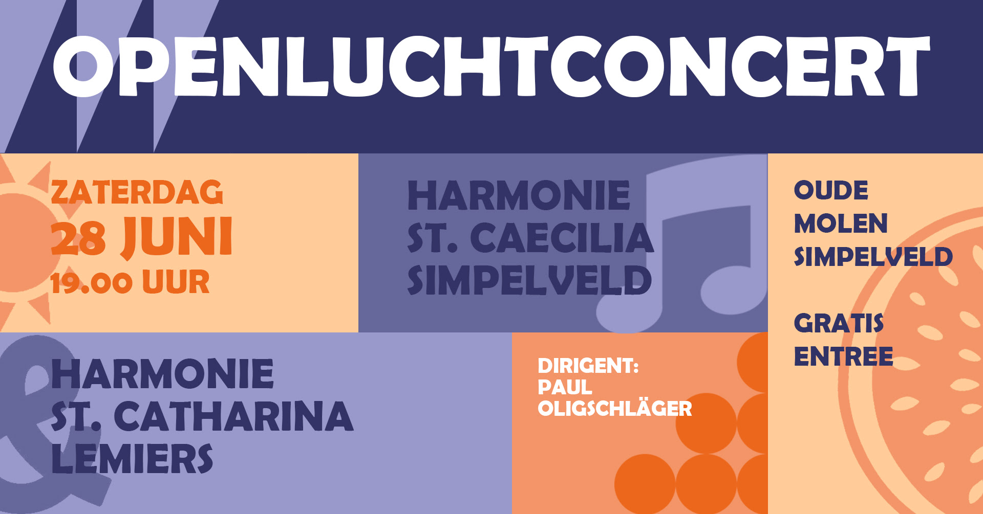 Op zaterdagavond 28 juni a.s. klinkt vanaf 19 uur mooie harmoniemuziek in de Oude Molen in Simpelveld. Harmonie St. Caecilia Simpelveld en St. Catharina Lemiers houden dan samen, als één orkest, een gratis toegankelijk Openluchtconcert als afsluiting van het muzikale seizoen. Het orkest staat onder leiding van dirigent Paul Oligschläger.