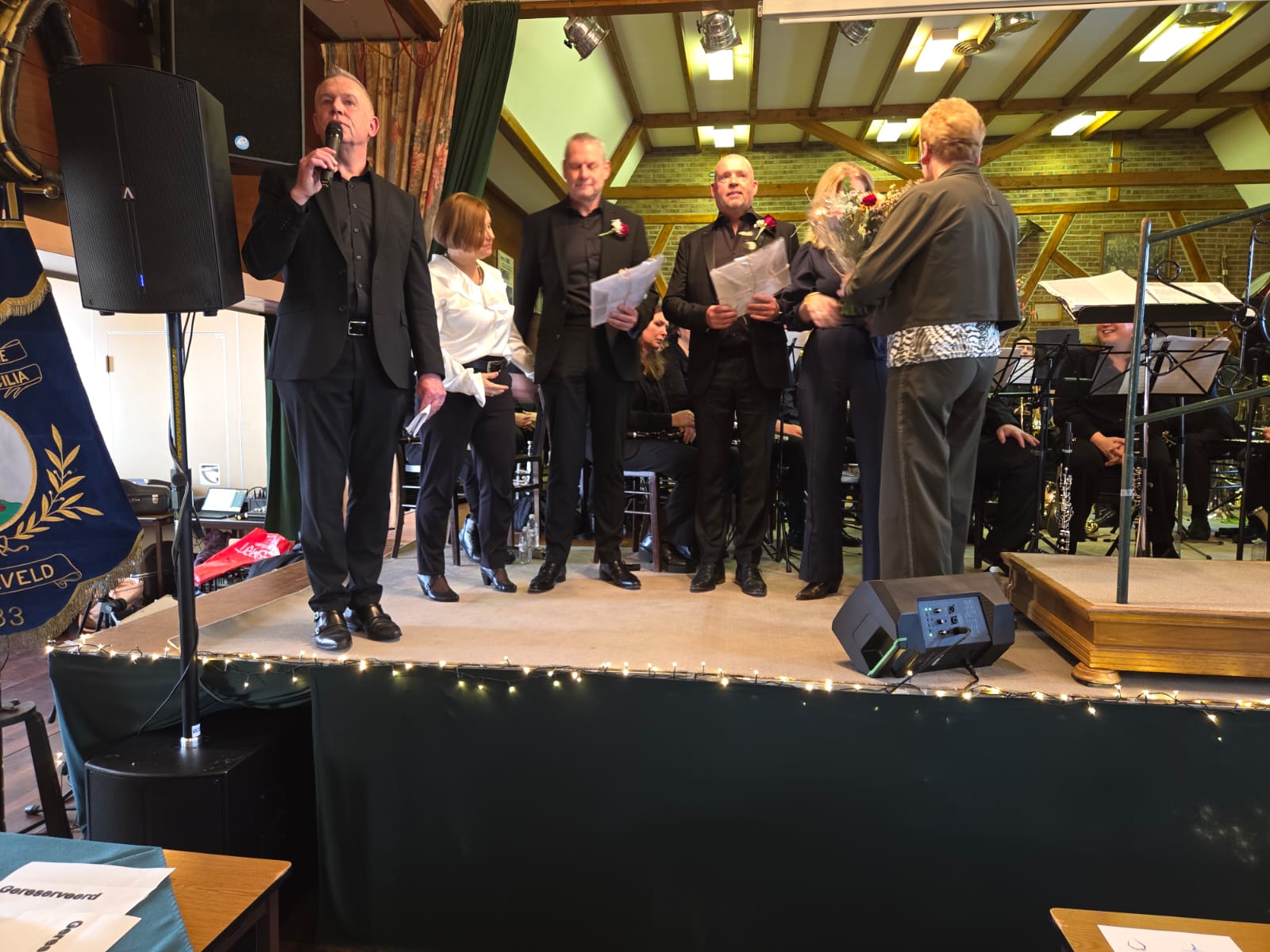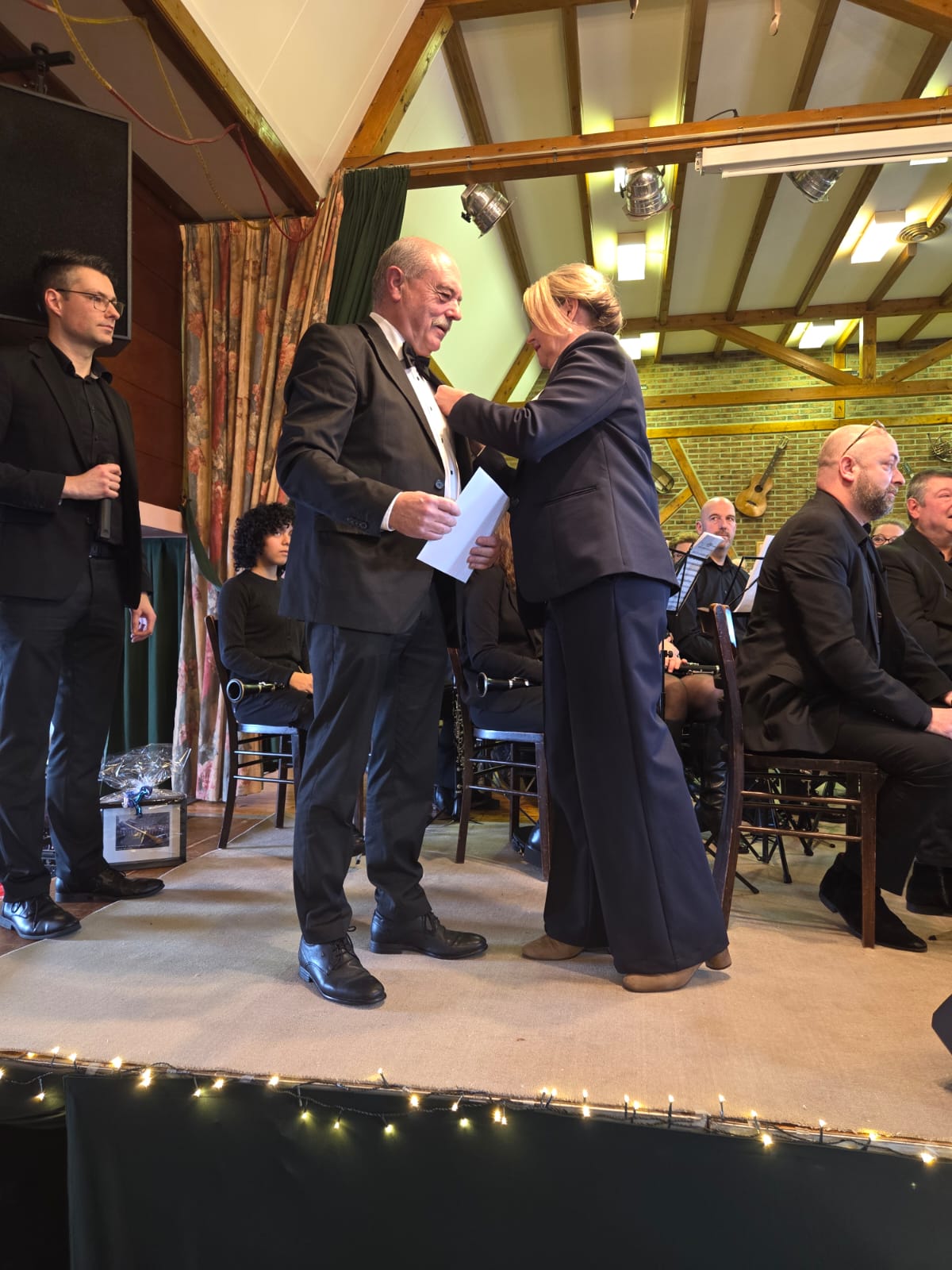 Beschermvrouwe Burgemeester Susanne Scheepers reikte de bijbehorende onderscheiding uit. Het 'stokje' werd zondag letterlijk doorgegeven aan de nieuwe dirigent Harmen Cnossen die vanaf deze week de gezamenlijke repetities gaat leiden. Op zaterdag 28 maart vindt het eerste concert o.l.v. Harmen plaats in de Obelisk in Vaals.